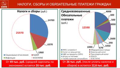 Если взять за основу среднюю зарплату по экономике в 49 тыс. руб. и вычесть все налоги, то остаётся 26 тыс. руб. Если вычесть ещё и обязательные платежи из этой зарплаты, то остаётся только 12 тыс. руб. Как жить семье на такие деньги? А пенсия в Московской области составляет 15 тыс. руб. – «живи, не горюй». Вот, почему мы, коммунисты, говорим, что политика олигархической власти – это политика в никуда, она уничтожает человека труда. Дико осознавать, что такие гроши платят работающему человеку.