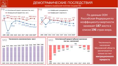 Я хотел бы обратить ваше внимание на вымирание России. Даже в годы Гражданской войны прирост населения составлял в России 1,5 млн. чел. в год. А сейчас что? Если взять статистику за последние годы в Московской области, она по демографии вся в минусе и держится по численности за счёт приезжих и мигрантов. Если взять Россию в целом, здесь тоже хорошо видно, что сложилась аналогичная ситуация, как и в Подмосковье. А если взять коэффициенты смертности, то мы на 187, из 196, месте в мире по убыли населения. А ведь наша Россия – это великая страна, богатейшая страна в мире, со всеми её ресурсами. А что будет дальше? Если оставить всё это в том же режиме, то будет только хуже. Вот, на Западе уже говорят, что в России можно оставить 90 млн. населения и достаточно.