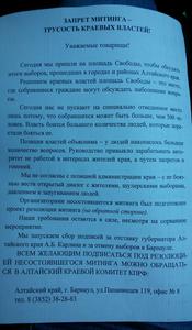 Во избежание эксцессов и провокаций Алтайский крайком КПРФ распространил среди собравшихся на площади Свободы оперативно подготовленные листовки. Текст листовки зачитала баранульцам и гостям краевого центра первый секретарь Алтайского крайкома КПРФ Мария Прусакова.