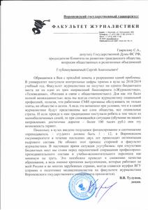 В ситуацию вмешался Сергей Гаврилов, депутат Государственной Думы от КПРФ, Председатель Комитета по развитию гражданского общества, вопросам общественных и религиозных объединений. Парламентарий обратился к Министру образования и науки Российской Федерации Ольге Васильевой, попросив вернуть журфаку ВГУ бюджетные места.