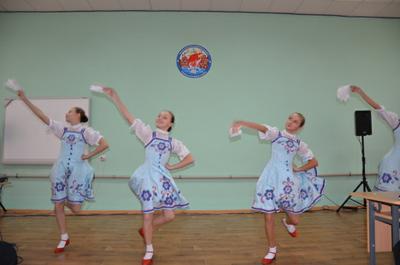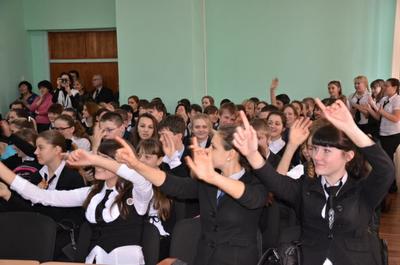 Испробовав пышный каравай, делегации отправились на торжественное собрание, которое проходило в Мариупольском технологическом лицее. Лицеисты встретили гостей русскими народными танцами и украинскими песнями.