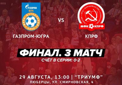 Внимание: 29 августа в 13-00 по московскому времени мини-футбольный клуб КПРФ сыграет один из важнейших матчей в своей истории. Во дворце спорта «Триумф» в Люберцах состоится третья игра Финала Суперлиги Чемпионата России «Газпром-Югра» — МФК КПРФ. В битве за золото наша команда ведет 2-0 в серии из пяти матчей до трех побед. Следим, поддерживаем, надеемся поставить точку! Прямая трансляция в 12.55 по федеральному каналу «Матч ТВ»!
