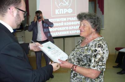 Перед обсуждением вопросов повестки дня первый секретарь крайкома КПРФ А.Н.Долгачев вручил группе делегатов благодарственные письма, а также принятым в ряды ЛКСМ выпускнице средней школы Анастасии Патенковой и учителю истории Юрию Шину - комсомольские билеты.