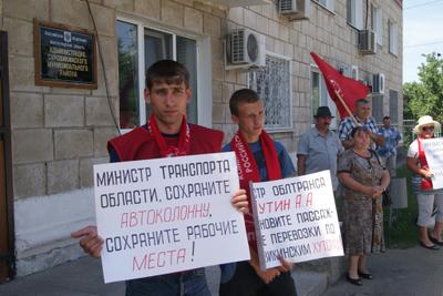 Водители автоколонны, рядовые жители района, а также активисты КПРФ держали растяжки с лозунгами: «Министр транспорта Волгоградской области, сохрани автоколонну! Сохрани рабочие места!», «Шульц, повернись лицом к населению!», «На наши требования – внятный ответ!», «Губернатор обещает много. На деле сокращает коллектив, оставляя людей без работы и средств существования».
