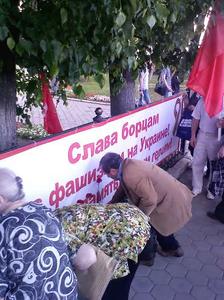 Кульминацией акции КПРФ стало восстановление растяжки со словами солидарности с украинскими братьями и скорби по жертвам фашизма, а также возложение к ней красных гвоздик.