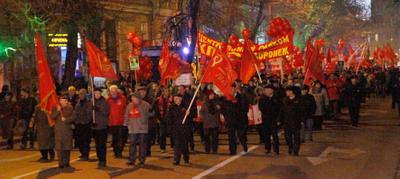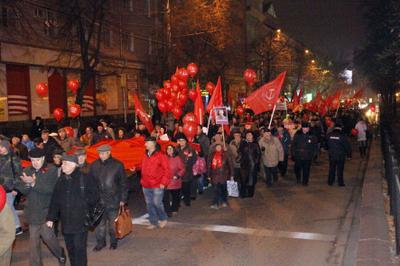 Вечером 7 ноября проспект Революции окрасился в кумачовый цвет. Десятки флагов СССР и КПРФ, красные шары с партийной символикой, красные накидки, шарфы и бантики, портреты В.И. Ленина и И.В. Сталина, лозунги: «Да здравствует 97-я годовщина Великого Октября!», «Россия! Труд! Народовластие! Социализм!», «Ленин жил, Ленин жив, Ленин будет жить!», «Программу КПРФ – в жизнь!», «Заводы – рабочим! Землю – крестьянам! Мир – народам!», «Россия и Новороссия – одна история, одна судьба», «НАТО, вон из хаты!», «КПРФ за мир!», «Детям войны – статус и льготы!» создавали праздничное, боевое настроение. В составе краснознамённой колонны - активисты КПРФ, Ленинского комсомола, Союза советских офицеров, организации «Дети военного времени» и женского союза «Надежда России» с растяжками своих организаций, представители трудовых коллективов – концерна «Созвездие», КБХА, «Электросигнала», механического и авиационного заводов, вузов Воронежа.