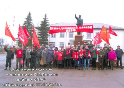 В Нижнедевицке на главной площади райцентра прошёл многолюдный митинг. Выступавшие – первый секретарь райкома, руководитель фракции КПРФ в райсовете М.И. Рукавицын, секретари райкома В.П. Сидоров, В.А. Чернухин, молодой коммунист Дмитрий Иванов говорили о том, как много значил для простых людей Великий Октябрь, вспоминали добрыми словами В.И. Ленина, посвятившего себя борьбе за освобождение трудящихся от векового гнёта. Подчёркивали, что достойное будущее России возможно только на пути обновлённого социализма, призвали приложить все силы, чтобы к 100-летию Октября в России сменились власть и курс в интересах большинства народа.
