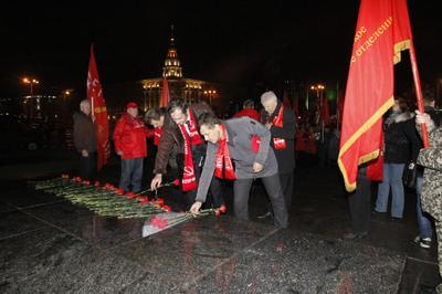 Завершая череду выступлений, секретарь обкома КПРФ, депутат городской Думы А.С. Померанцев выразил общее возмущение действиями буржуазной власти, которая продолжает грабить и отуплять народ, ведёт нападки на советскую эпоху. Провокационные выпады депутата от «Единой России» г-жи Поклонской, посмевшей сравнить Ленина с Гитлером, и министра образования г-жи Васильевой, назвавшей Сталина тираном, не останутся безнаказанными и получат самый жёсткий отпор.