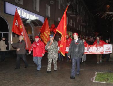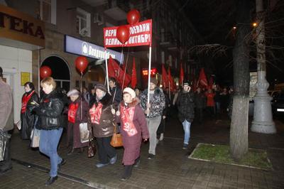 Увеличиваясь численно, многолюдная колонна шла от площади Победы под энергичные марши и мелодии революционных песен в исполнении духового оркестра, создававшего особую праздничную атмосферу. Звучали речевки: «Слава Великому Октябрю!», «Красные в городе!», «Слава Ленину, слава Сталину!», «Да здравствует Коммунистическая партия Российской Федерации!». «Ленин, партия, комсомол!» - это скандировали молодые ребята и девчонки, смена сегодняшних коммунистов. Десятки флагов КПРФ и комсомола, копии Знамени Победы, красные шары, бантики, накидки и бейсболки, портреты Ленина и Сталина, лозунги «Вернём завоевания Великого Октября!», «Россия, труд, народовластие, социализм!», «Власть миллионам, а не миллионерам!», «Долой диктатуру олигархов и чиновников!», «Народовластию – да!» подчеркивали одновременно и праздничную, и протестную направленность акции КПРФ и её союзников. Проезжающие мимо автомобили сигналили, приветствуя демонстрантов.