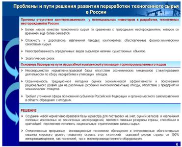 Это сложилось вопреки очевидной целесообразности объединить усилия профильных ведомств и организаций в единое целое под одним административным и научно-методическим руководством с целью согласованности решения самых ответственных задач, связанных с освоением выявленных техногенных месторождений и подготовкой для этого отечественной технико-технологической базы.
