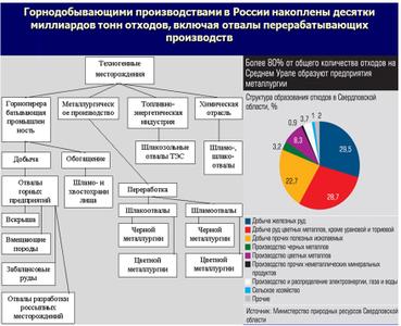 Горнодобывающими производствами в России накоплены десятки миллиардов тонн отходов, включая отвалы перерабатывающих производств. Наибольшие объемы отходов сосредоточены в Уральском федеральном округе (на долю Свердловской области приходится до 30% отходов в РФ), районе Курской магнитной аномалии, Тульской и Рязанской областях.