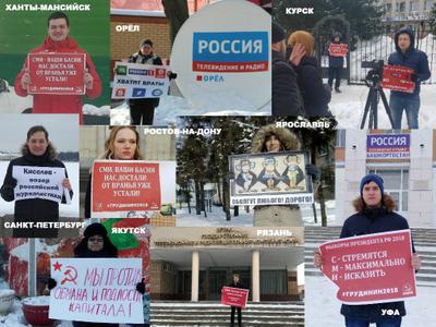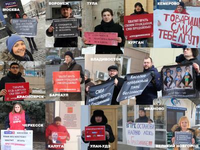 Коммунисты и комсомольцы отреагировали молниеносно на очередную истерию провластных СМИ: во вторник, 20 февраля, по всей стране активисты вышли к филиалам ВГТРК с предложением Дмитрию Киселёву держать свой «язык без костей» за зубами. За сутки пикеты прошли в 48 регионах страны: от Приморского края до Калининградской области.