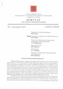 В этой связи, руководствуясь ст.ст. 7, 14 Федерального закона «О статусе члена Совета Федерации и статусе депутата Государственной Думы Федерального Собрания Российской Федерации», прошу безотлагательно рассмотреть настоящее депутатское обращение (запрос), поручить провести проверку изложенных в нем фактов массовых нарушений по фактическому массовому сокрытию от большинства москвичей необходимой информации о проводимых выборах, экстренно принять надлежащие меры реагирования к восстановлению законности, восстановлению массового нарушаемых прав избирателей на почти всех избирательных участках столицы, к устранению допущенных грубых нарушений законодательства о выборах, и привлечению всех виновных в этом лиц к установленной ответственности за противозаконное блокирование избирательного процесса.