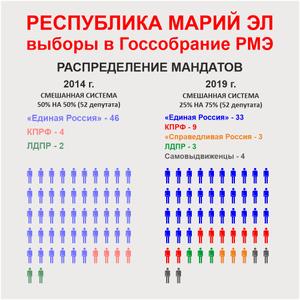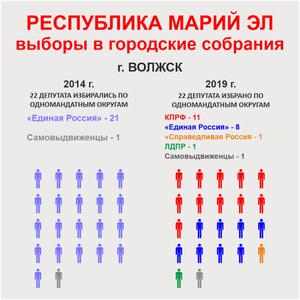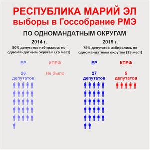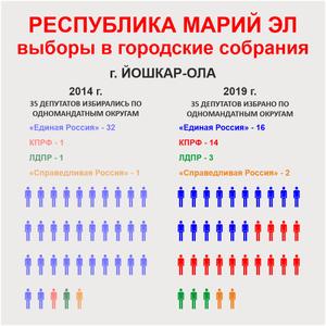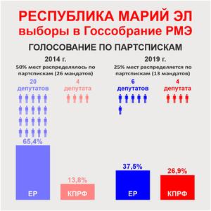Вдвое ухудшились показатели «Единой России». На этих выборах их партсписку удалось получить лишь 37,5% голосов избирателей (в 2014 году было 65,4%). Причём в столице Марий Эл Йошкар-Оле КПРФ при голосовании по партспискам заняла первое место. А во втором по численности населения городе Волжске КПРФ не просто обошла «Единую Россию», а стала первой на 28 избирательных участках из 30.