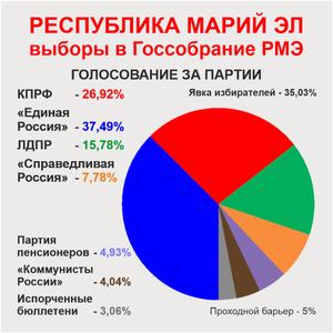 В крупнейшем районном центре республики – посёлке Медведево из 15 мест в поселковом собрании 7 получила КПРФ, 5 – ЛДПР, 2 – «Единая Россия» и 1 – «Справедливая Россия».