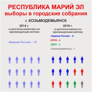 Коммунисты серьезно укрепили свои позиции во всех трёх городах республиканского значения. В Йошкар-Оле кандидаты от КПРФ победили в 14 округах из 35. В Волжске – в 11 округах из 22. В Козьмодемьянске – в 4 округах из 15. В итоге в трёх городских округах КПРФ суммарно получила 29 мест, а «Единая Россия» - 32 места. Причём в предыдущих составах горсобраний КПРФ была представлена лишь в Йошкар-Оле одним депутатом, а во фракциях «Единой России» в этих трёх городах состояло 69 депутатов.