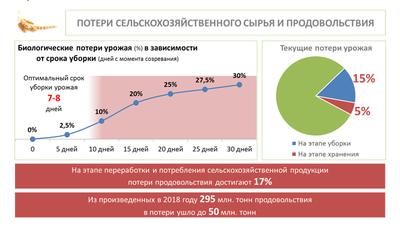 Из 295 миллионов тонн произведенного в 2018 году продовольствия теряется 50 млн. тонн. Только на этапе уборки урожая потери составляют 15% - в динамике по дням это видно наглядно. И если мы будем продолжать действовать в таком же режиме, то потери будут только расти.
