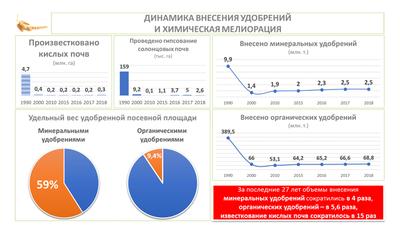 При этом наши хозяйства вносят в почву всего 69 миллионов тонн органики, а не так давно вносили до 400 млн. тонн. Аналогично по минеральным удобрениям, 10 миллионов тонн вносили, а сегодня и до трех не дотягиваем. Известкование кислых почв сократилось в 15 раз!