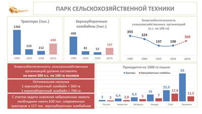 Исходя из этого, наша ближайшая задача добавить к этим 57 тыс. комбайнов еще минимум 100 тыс. единиц, а также выйти на уровень оснащения в 640 тысяч тракторов. Энергообепеченность наших хозяйств должна быть хотя бы 300 л.с. на 100 гектар посевных площадей, при том, что в 1990 году у нас было 393 л.с. на 100 га. Эту задачу надо решать прорывным способом!
