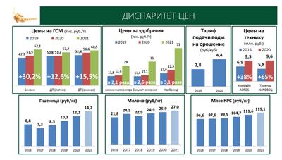 Мы целый год добиваемся принятия решительных мер по урегулированию цен на минеральные удобрения, но все равно в 3,1 раза увеличилась цена карбамида, в 2,1 раза – аммиачной селитры, и так далее. Посмотрите, трактор, комбайн сегодня уже по 10 миллионов рублей стоят. Тарифы электроэнергии 8 руб/кВт/ч, подачи воды на орошение – все стремится вверх.