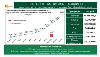 Экспортные пошлины удерживают цены на пшеницу на уровне 14 тыс. рублей за тонну при сложившейся себестоимости 12-13 тыс. рублей за тонну! А это значит, что рентабельность на этом уникальном направлении будет провалена.