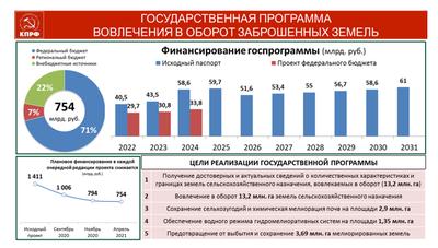 Сколько же можно крутиться на посевной площади 80 миллионов га, при том, что не так давно у нас было 117 млн. га пашни? Должен быть четкий шаг – на полтора миллиона гектар каждый год мы должны прирастать. А для этого надо мотивировать к уничтожению этих зарослей и бурьянов. Мы ждём от этой программы очень серьёзных преобразований, в том числе исходя из бедственного положения, в котором оказались наши почвы.