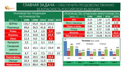 Мы вышли сегодня на плато 125-126 миллионов тонн валового урожая зернобобовых культур. Но с этой вершины мы уже можем посмотреть на горизонт 2030 года и увидеть все возможности получать по 160 млн. тонн зернобобовых, по 45 млн. тонн молока, увидеть 15-17 миллионов гектар орошаемых земель, 350 тысяч гектар новых плодоносящих плантация плодовых и виноградников, которые дадут 8-9 миллионов тонн продукции, а также 7 миллионов тонн рыбной продукции!