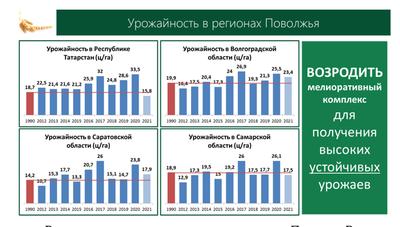 Хочу заострить внимание, когда из-за засухи сокращается срок налива хотя бы на один день, мы теряем 1 центнер с гектара. А в этом году у нас во многих районах на 10-14 дней срок налива сокращался! А если мы суммируем все лимитирующие факторы урожая от засухи, недостатка удобрений, качества семенного материала, и до отсутствия научно обоснованного количества комбайнов, сушильного хозяйства, логистики, кадрового обеспечения, то мало не покажется. Вот и получаем урожай тот, который показало Поволжье. Необходимо также учесть, что климат меняется. Исходя из этого, другие должны быть шаги в развитии мелиорации!