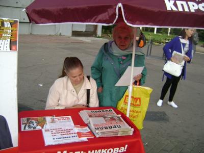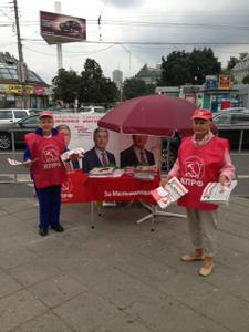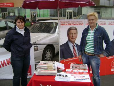 В оставшиеся до выборов дни активисты КПРФ развернули на улицах российской столицы широкую агитационную кампанию. Большими тиражами изданы агитационные спецвыпуски «Правды» и «Правды Москвы», различные листовки. Для проведения пикетов подготовлена вся необходимая партийная атрибутика: красные зонтики, столики, накидки, кепки с символикой КПРФ, баннеры с изображением нашего кандидата. На фото представлены пикеты КПРФ в различных уголках столицы. Автолюбители также размещают на задних стеклах своих авто агитационные плакаты-наклейки.