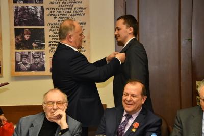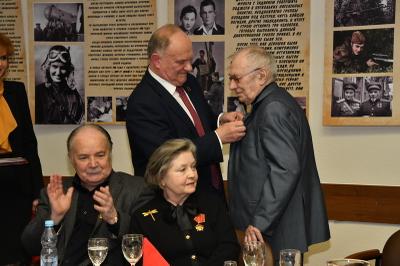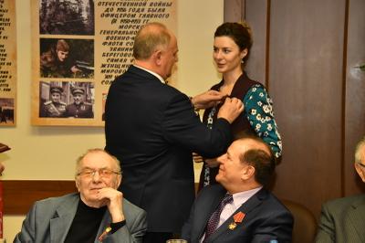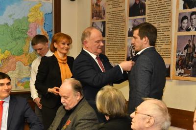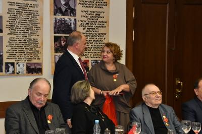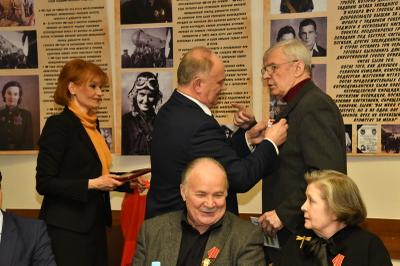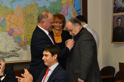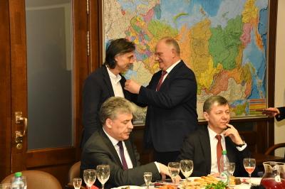 Затем состоялось награждение деятелей культуры памятными медалями ЦК КПРФ «100 лет Великой Октябрьской социалистической революции». Награды вручал Г.А. Зюганов. Среди награжденных актеры Николай Губенко, Жанна Болотова, Аристарх Ливанов, Людмила Зайцева, певцы Василий Овсянников, Надежда Крыгина и другие – это все творческие люди, которые на протяжении многих лет сотрудничают с КПРФ.