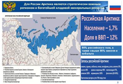 Для России Арктика является стратегически важным регионом и богатейшей кладовой минеральных ресурсов. Данные на слайде убедительно это подтверждают. При населении 1,7% от численности населения Российской Федерациироссийская Арктика производит двенадцать процентов валового внутреннего продукта страны. Получается, что удельная отдача остальных регионов страны почти в восемь раз ниже. Не следует забывать, что в советский период времени потребовалось для реализации сырьевого потенциала Сибири и Заполярья – гигантские вложения.