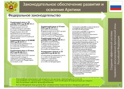 Анализ арктического законодательства показывает, что в настоящее время действует более пятисот нормативно-правовых актов, в том числе Федеральные законы «О континентальном шельфе Российской Федерации», «О внутренних морских водах, территориальном море и прилежащей зоне Российской Федерации», «Об исключительной экономической зоне Российской Федерации», «О гидрометеорологической службе» и другие, которые регулируют правоотношения в Арктической зоне Российской Федерации.