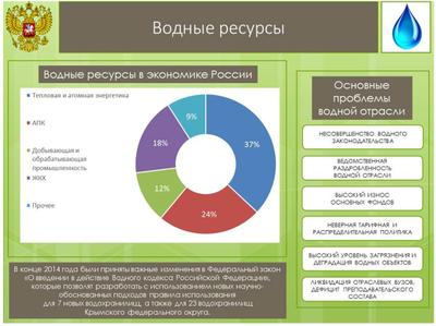 В конце 2014 года были приняты важные изменения в Федеральный закон «О введении в действие Водного кодекса Российской Федерации», которые позволят разработать с использованием новых научно-обоснованных подходов правила использования для 7 новых водохранилищ, а также для 23 водохранилищ Крымского федерального округа.