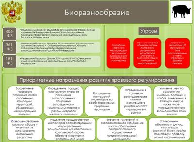 В части вопросов сохранения биологического разнообразия значительным шагом явилось принятие Федерального закона от 28 декабря 2013 года № 406-ФЗ «О внесении изменений в Федеральный закон «Об особо охраняемых природных территориях» и отдельные законодательные акты Российской Федерации, в соответствии с которым усилена правовая составляющая процедуры создания и расширения особо охраняемых природных территорий, организации их охранных зон, установлена возможность софинансирования расходных обязательств, связанных с развитием ООПТ и возможность предоставления служебных наделов инспекторам, работающим на особо охраняемых природных территориях. В целом, принятый Закон ужесточил особый режим ООПТ, окончательно определив их как природные территории, создаваемые в целях сохранения природных комплексов и объектов.