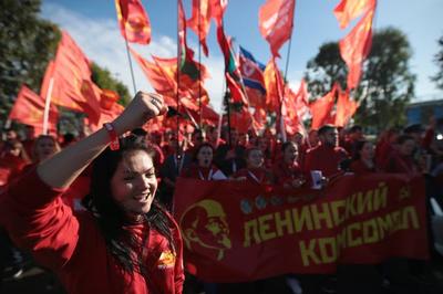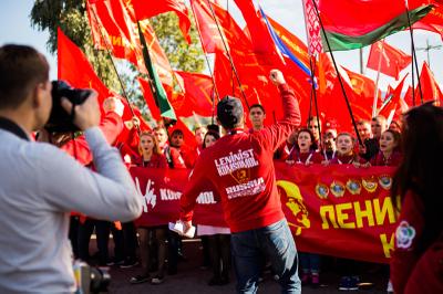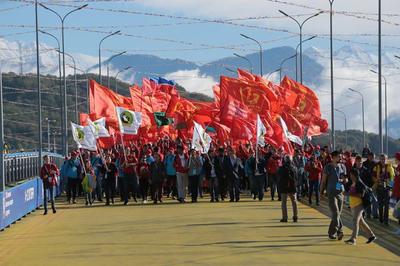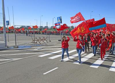 После митинга делегация ЛКСМ РФ отправилась на панельную дискуссию на тему: «100 лет Великой Октябрьской социалистической революции» в главном медиацентре. До места комсомольцы вновь шли организованной колонной: на ветру развевались красные флаги, звучали революционные кричалки.