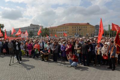 28 июля на площади Пименова состоялся организованный КПРФ митинг против повышения пенсионного возраста. К митингу готовились давно, за 40 минут до начала устанавливались красные палатки – коммунисты Октябрьского, Заельцовского, Центрального районов приглашали поучаствовать в общенародном опросе по поводу пенсионной реформы. По подсчетам первого секретаря Центрального райкома КПРФ Камиля Джафарова, только его организация за несколько минут собрала более 50 подписей, возле палаток выстраивались небольшие очереди. К началу митинга плошадь возле ГНПТБ была заполнена – собралось, по приблизительным подсчетам, более 2 тысяч человек.
