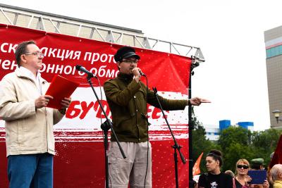 Среди выступавших на митинге было немало молодых левых активистов – как, например, координатор «Левого фронта» в Новосибирской области Аркадий Булатов, который в самом начале своей речи напомнил, что красный цвет – это цвет Победы. Представитель РКСМ Андрей Шевченко подчеркнул, что правительство, повышая пенсионный возраст, находит средства для компенсации «пострадавшим от санкций» олигархам. Он призвал создать коалиционное правительство на основе левых сил.