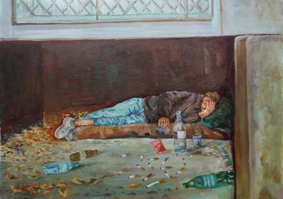 Прежде всего, меня волнует тема «Что с нами происходит? (В.М. Шукшин)». На краевых художественных выставках экспонировались в разное время картины «Бомж», «На дне», «Помогите, Христа ради». Общий мотив работ - это люди опустившиеся, безнадежные, «лишние» в нашей жизни. Вот «Бомж»: молодой, заросший, грязный, неумытый, устроивший себе лежак на мусорке, от усталости уснул. Он ничего не замечает, не слышит, как люди на мусорку вываливают бытовые отходы.