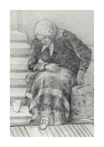 Мотив еще одной зарисовки я взял с натуры в так называемый «День согласия и примирения». На трамвайной остановке «Докучаево», когда я увидел эту женщину, сидящею непонятно на чем, то не поверил, что это вообще живой человек, а не какое-то нагромождение. Делая зарисовку, не сразу мне стало понятно, что передо мной сидит живая женщина. Вокруг нее было сложено несколько сумок, пакетов, перед ней стояла чашка для сбора подаяния.