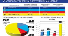 Исходя из объемов избирательных фондов, Центризбирком посчитал, сколько каждая из думских партий потратила на одного избирателя. Получилось, что самую эффективную с точки зрения бухгалтерии кампанию провели коммунисты. Им каждый голос достался по цене 43 рубля, а один мандат обошелся в 8,8 млн рублей. Самой неэффективной стала «Справедливая Россия»: при условной стоимости одного мандата в 52,9 млн рублей за каждый голос партия заплатила 258 рублей, то есть примерно в шесть раз больше, чем КПРФ. «Единой России» голоса и мандаты обошлись соответственно в 79 рублей и 16,2 млн рублей каждый. ЛДПР потратила на получение одного мандата 20,6 млн рублей, заплатив из предвыборного фонда по 101 рублю за каждый голос избирателя.