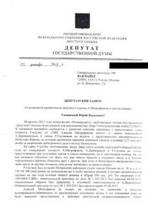 Ответ СКР не заставил себя долго ждать. Спустя месяц Следственный комитет РФ направил запрос генпрокурору Юрию Чайке, в котором говорится о наличии оснований для лишения председателя комитета по СМИ Госдумы Алексея Митрофанова депутатской неприкосновенности. Следствие намерено допросить депутата Митрофанова в качестве свидетеля по уголовному делу о вымогательстве в 2012 году $200 тыс. с экс-соучредителя компании "Арктур-Строй" Вячеслава Жарова за помощь в арбитражном разбирательстве.