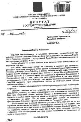 Как уже сообщали СМИ, депутат Госдумы от фракции КПРФ В.И.Илюхин направил 2 апреля председателю Правительства России В.А.Зубкову письмо по проблеме возможных финансовых злоупотреблений при подготовке к Зимней Олимпиаде 2014 г. в г.Сочи.