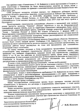 Рассмотреть вопрос о целесообразности пребывания СМ. Вайнштока на посту главы «Олимпстроя» в связи с многочисленными высказываниями в его адрес подозрении в коррупции, сознательном раздувании бюджета Олимпиады и других действиях, объективно ведущих к срыву Зимних Олимпийских игр 2014. Одновременно прошу сообщить: