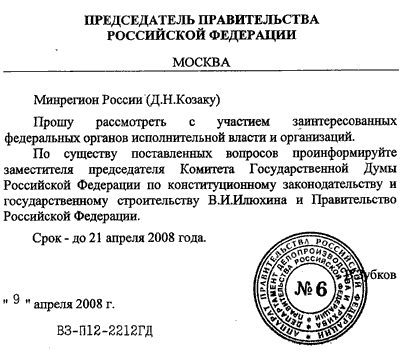 "Премьер-министр Зубков отреагировал на письмо депутата фракции КПРФ В.И.Илюхина по ситуации в "Олимпстрое"