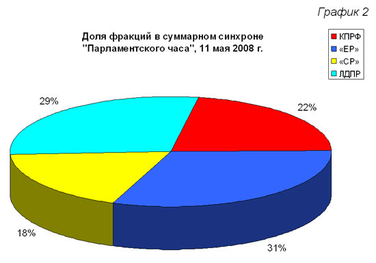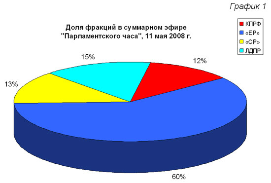 11 мая 2008 года в передаче «Парламентский час» на телеканале «Россия» фракции КПРФ было посвящено 2 минуты 56 секунд, или 12%. Фракция «Единая Россия» заняла 60% эфира передачи, или 14 мин 49 сек, что в 5 раз больше, чем КПРФ. ЛДПР заняла 15% эфира передачи или 3 мин 43 сек, что на четверть больше, чем КПРФ.