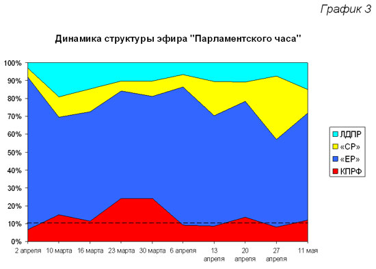 Доля эфира, предоставленного передачей «Парламентский час» каждой из фракций, менялась в течение марта-мая следующим образом (График 3):