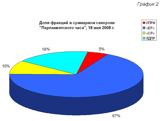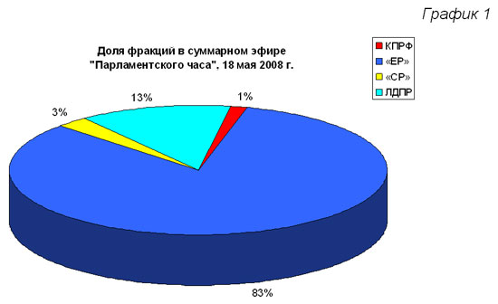 18 мая 2008 года в передаче «Парламентский час» на телеканале «Россия» фракции КПРФ было посвящено 29 секунд, или 1%. Фракция «Единая Россия» заняла 83% эфира передачи, или 27 мин 59 сек, что в 57 раза больше, чем КПРФ, ЛДПР досталось 13% эфира или 4 мин 22 сек, что в 9 раз больше, чем КПРФ, «Справедливой России» было предоставлено 3% эфира или 56 сек, что в 2 раза больше, чем КПРФ.