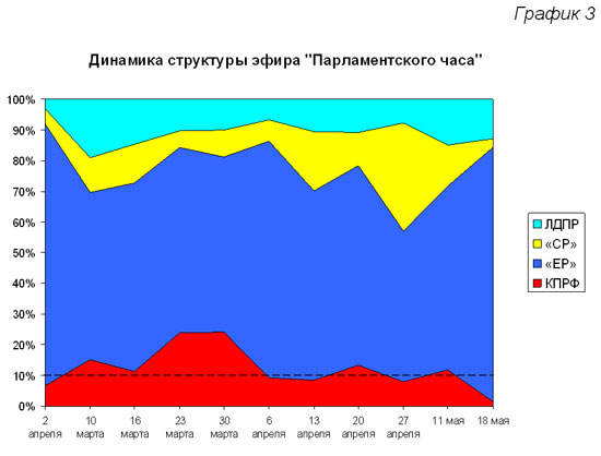 Доля эфира, предоставленного передачей «Парламентский час» каждой из фракций, менялась в течение марта-мая следующим образом (График 3):