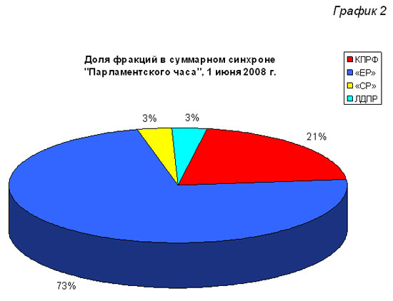 1 июня 2008 года в передаче «Парламентский час» на телеканале «Россия» фракции КПРФ было посвящено 3 минуты 18 секунд, или 16%. Фракция «Единая Россия» заняла 81% эфира передачи, или 17 мин 11 сек, что в 5 раз больше, чем КПРФ.