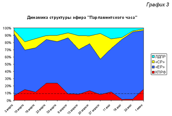 Доля эфира, предоставленного передачей «Парламентский час» каждой из фракций, менялась в течение марта-июня следующим образом (График 3):